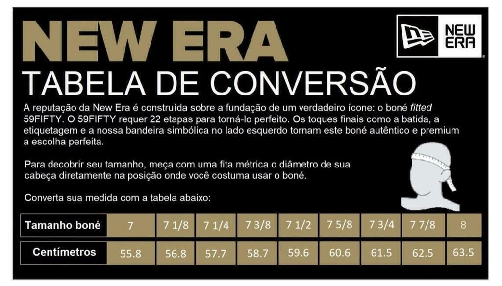O boné New Era® 59FIFTY® é confeccionado em tecido leve e recebe a bandeira New Era® na lateral esquerda. Moderna, a aba reta é estilosa e proteje o rosto dos raios solares. As vias respiráveis na parte superior ficam responsáveis por dissipar a umidade e garantem aquela sensação agradável de bem-estar. Muito resistente, conta com costuras reforçadas, o que contribui no aumento da durabilidade. Os fitteds da New Era® são como tênis, tem um número específico para cada tamanho. Para medir a sua cabeça, use uma fita métrica exatamente onde a sweatband (a faixa de tecido na parte interna do cap, aonde vão as etiquetas de tamanho) vai ficar quando o boné estiver em sua cabeça. Converta com a tabela e veja qual o 59FIFTY® da New Era® que faz a tua cabeça.