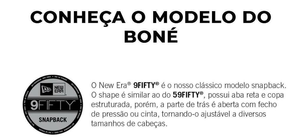 O 9FIFTY™ Original Fit é confeccionado em tecido resistente e recebe clássica flag New Era® na lateral esquerda. As vias respiráveis na parte superior ficam responsáveis por dissipar a umidade e garantem aquela sensação agradável de bem-estar. Muito resistente, conta com costuras reforçadas, o que contribui no aumento da durabilidade. O 9FIFTY™ Original Fit vem com a aba em um formato quadrado e mais curto, a copa do boné vem um pouco mais reta e o cap é mais raso, sendo um modelo FIT que não cobre as orelhas e tem as linhas mais retas. Seu fechamento é prático e garante um ajuste preciso à cabeça. The 9FIFTY™ Original Fit, reinventamos um clássico. Prove esse FIT.